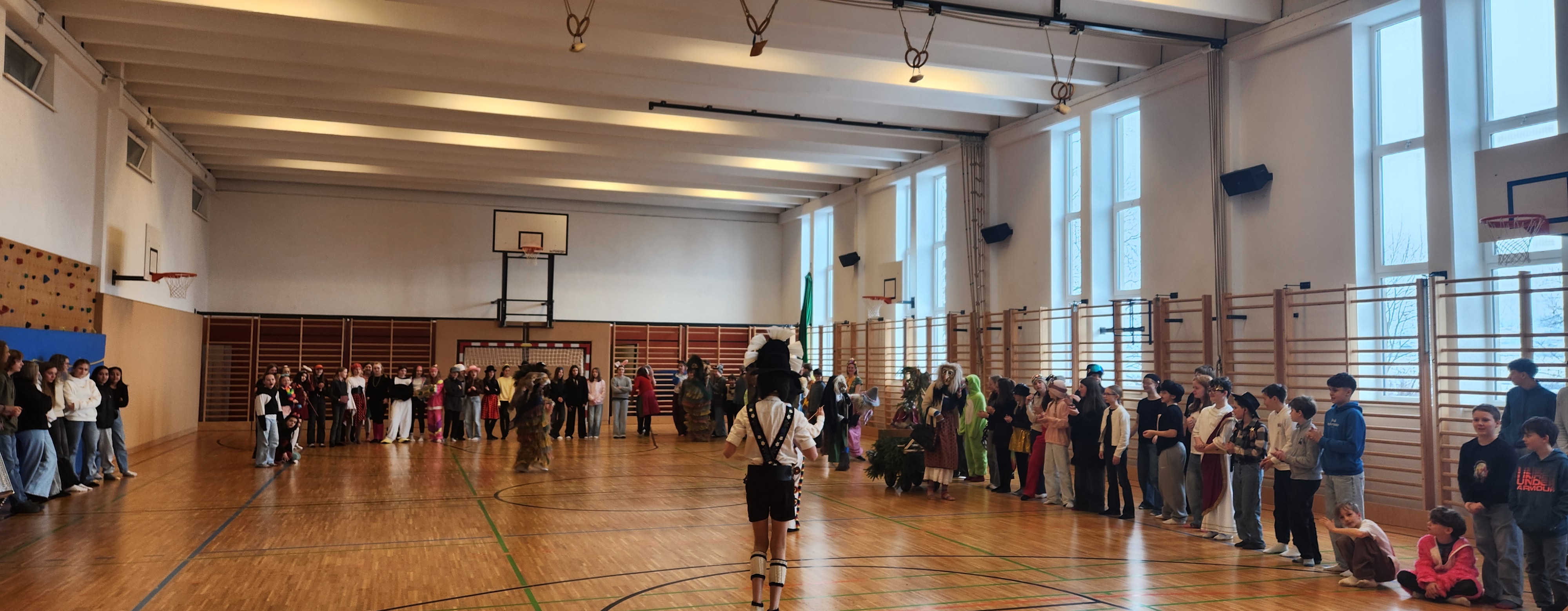 Für eine besondere Überraschung sorgten kürzlich unsere Schülerinnen und Schüler der Unterstufe: Ganz ohne organisatorischen Rahmen von Lehrpersonen planten sie eigenständig einen Matschgerer-Auftritt – und setzten ihn in der großen Pause mit beeindruckender Selbstständigkeit um.