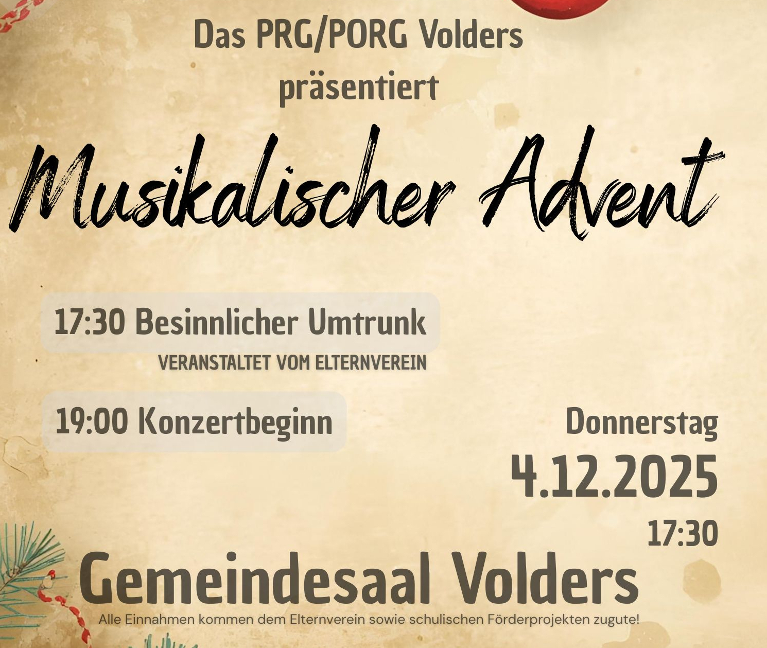 Wir laden herzlich zum traditionellen Adventkonzert des PRG/PORG Volders am Do., 04. Dezember 2025 im Gemeindesaal Volders ein.