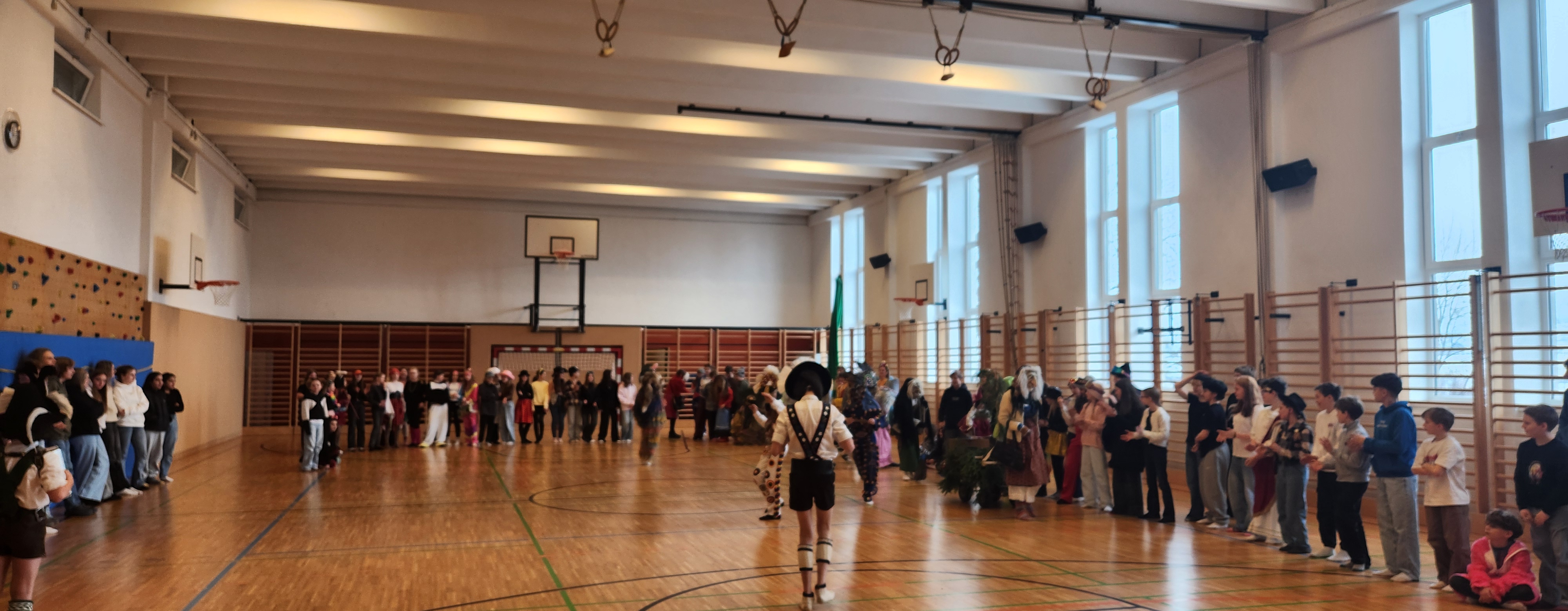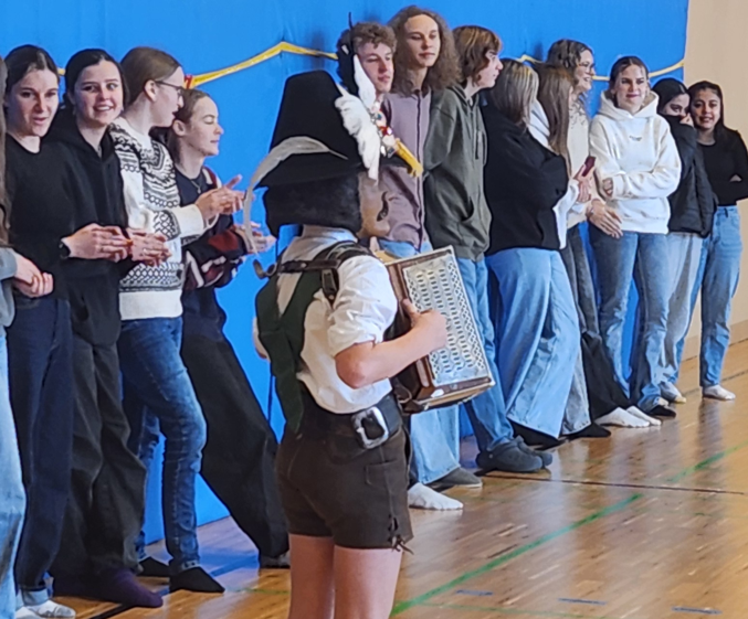 Für eine besondere Überraschung sorgten kürzlich unsere Schülerinnen und Schüler der Unterstufe: Ganz ohne organisatorischen Rahmen von Lehrpersonen planten sie eigenständig einen Matschgerer-Auftritt – und setzten ihn in der großen Pause mit beeindruckender Selbstständigkeit um.